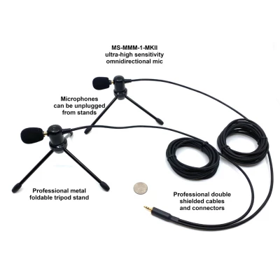 The MS-MMM-1-MKII professional microphone is a very small, one piece ultra-high gain, ultra-high sensitivity, ultra-low noise microphone that can be plugged into any steno machine, digital recorder or standard computer microphone input jack. The microphone is very small, measuring about 1.25″ long. Included is our best folding tripod. Simply plug the mic into the tripod and you are ready to go!