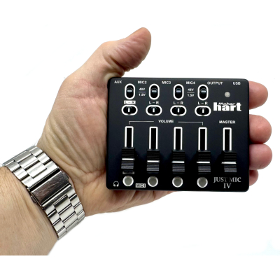 Ultra-portable mini 6 channel microphone mixer with portable phantom power/audio interface for podcasts, streaming, conferences. USB and Analog outputs